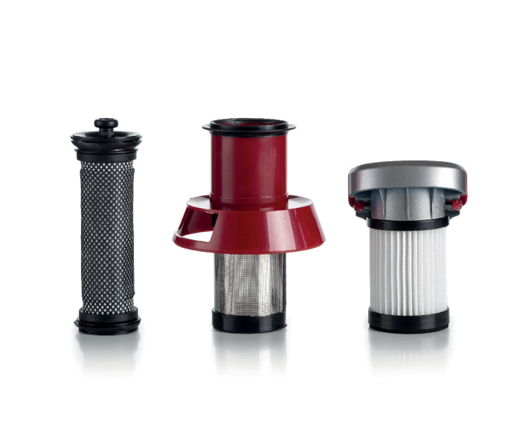 Cordless electric broom with 2200 mAH lithium-ion rechargeable battery that becomes a portable handheld vacuum cleaner. 3 levels of Filtration. Motorized brush with LED lights and accessory kit supplied. Red